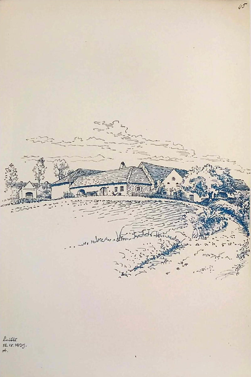 A na posledním porovnání nemůže chybět nic jiného, než naše maličkost Malý Statek 🙂 Samotná podoba statku se zas tak nezměnila, ale na původní skice jsou jasně patrné prvky selského baroka. Mezi ně patří atika, falešná okna a brány s obloukovou klenbou. Atika je nástavba nad římsou, která vytváří dojem dalšího patra a obsahuje několik falešných oken. Původní atika se již nedochovala, obloukové klenby byly v průběhu času nahrazeny rovnými a korouhvičky ve tvaru vlajek už také chybí. Napravo od statku je vidět bývalý rybníček ze třetí skici.